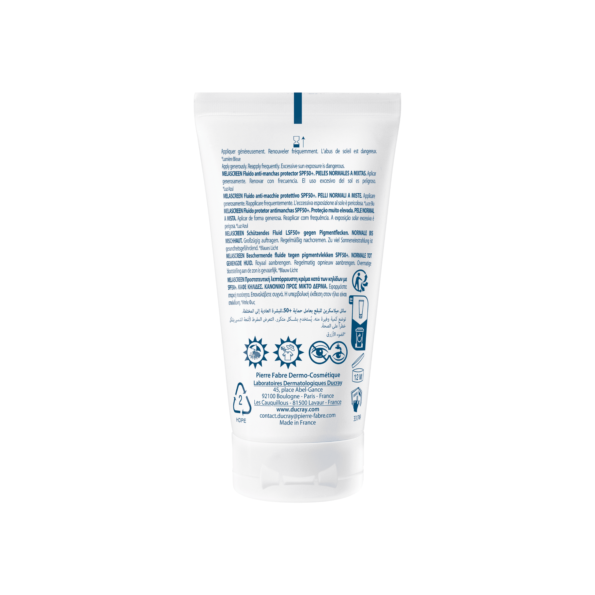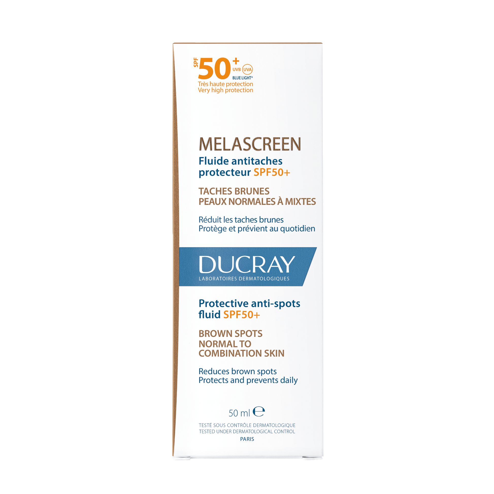 ANTI-MANCHAS OSCURAS, ANTI-POLUCIÓN. RESISTENTE AL AGUA Y AL SUDOR. Amplio espectro (UVB, UVA, Luz Azul). Fluido "tacto seco" de textura ligera hidratante con acabado invisible.